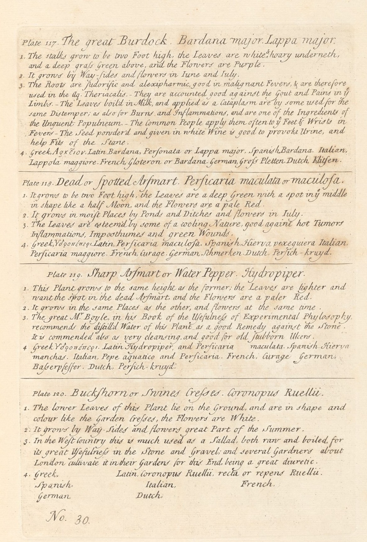 This is the text for the page 117-120 The great Burdock, Dead or spotted Arsmart, Sharp Arsmart, Buckshorn in A Curious Herbal, Blackwell, 1739.