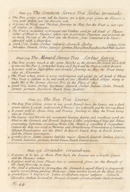 This is the text for the page 173-176 Common Service Tree, Manur'd Service Tree, Bay Tree, Coriander in A Curious Herbal, Blackwell, 1739.
