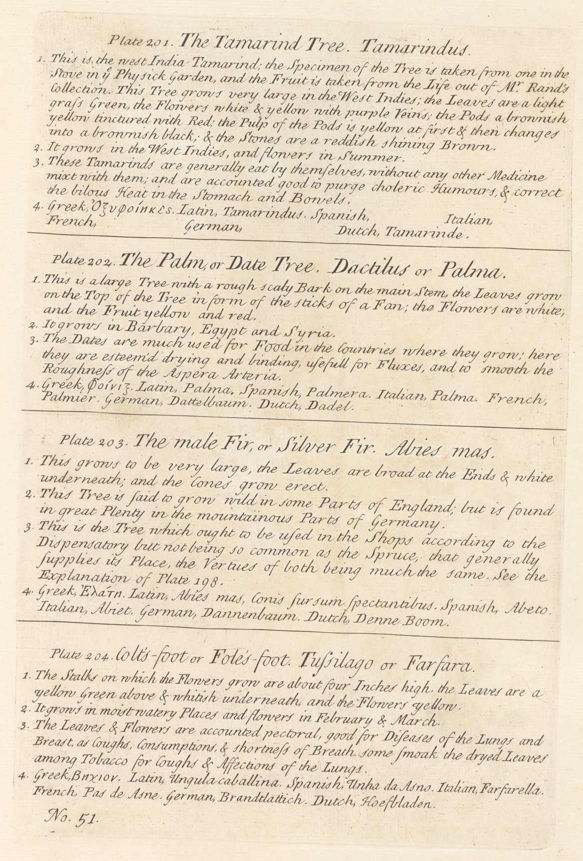 This is the text for the page 201-204 The Tamarind Tree, The Palm or Date Tree, The male Fir or Silver Fir, Colt's-foot in A Curious Herbal, Blackwell, 1739.