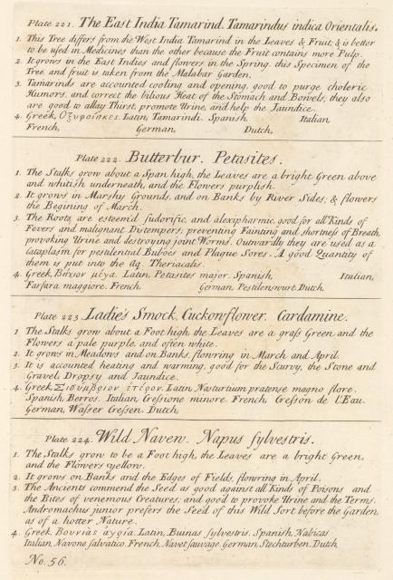 This is the text for the page 221-224 The East India Tamarind, Butterbur, Ladie's Smock, Wild Naven in A Curious Herbal, Blackwell, 1739.