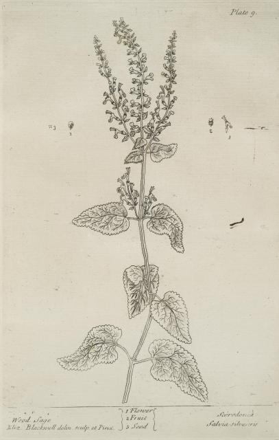 The text for this image is found on the page 009-012 Wood Sage, Sage, White Lilly, Stinging Nettle. in A Curious Herbal, Elizabeth Blackwell, 1737 (Vol. 1), 1739 (Vol. 2).