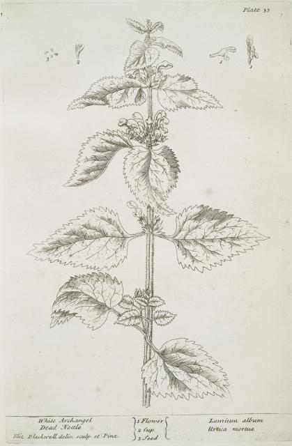 The text for this image is found on the page 033-036 White-Archangel, Woody Night-Shade, Broad-leaved Plantain, Borrage in A Curious Herbal, Elizabeth Blackwell, 1737 (Vol. 1), 1739 (Vol. 2).