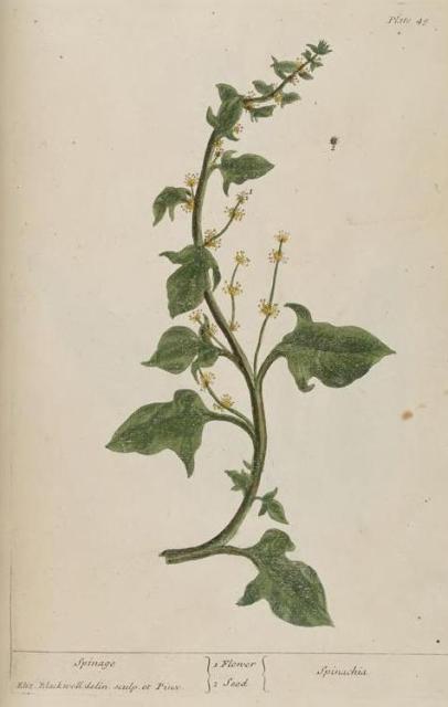 The text for this image is found on the page 049-052 Spinage, Wild teasel, Pilewort, Primrose in A Curious Herbal, Elizabeth Blackwell, 1737 (Vol. 1), 1739 (Vol. 2).
