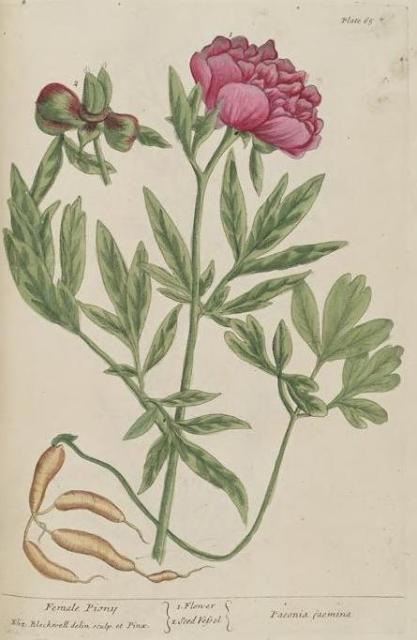 The text for this image is found on the page 065-068 Female Piony, great Blew Bottle, May-Weed, Treacle Mustard. in A Curious Herbal, Elizabeth Blackwell, 1737 (Vol. 1), 1739 (Vol. 2).