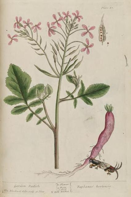 The text for this image is found on the page 081-084 Garden Radish, Damask Rose, Pease, Hedge Nettle in A Curious Herbal, Elizabeth Blackwell, 1737 (Vol. 1), 1739 (Vol. 2).