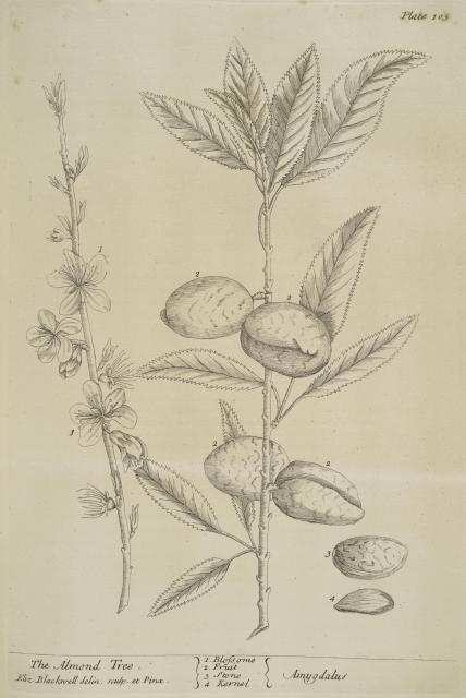 The text for this image is found on the page 105-108 Almond Tree, Marygolds, Night-Shade, Wild Cucumber in A Curious Herbal, Elizabeth Blackwell, 1737 (Vol. 1), 1739 (Vol. 2).