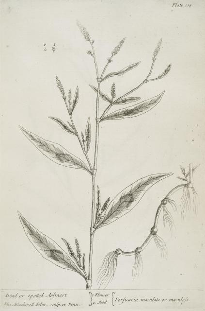 The text for this image is found on the page 117-120 The great Burdock, Dead or spotted Arsmart, Sharp Arsmart, Buckshorn in A Curious Herbal, Elizabeth Blackwell, 1737 (Vol. 1), 1739 (Vol. 2).