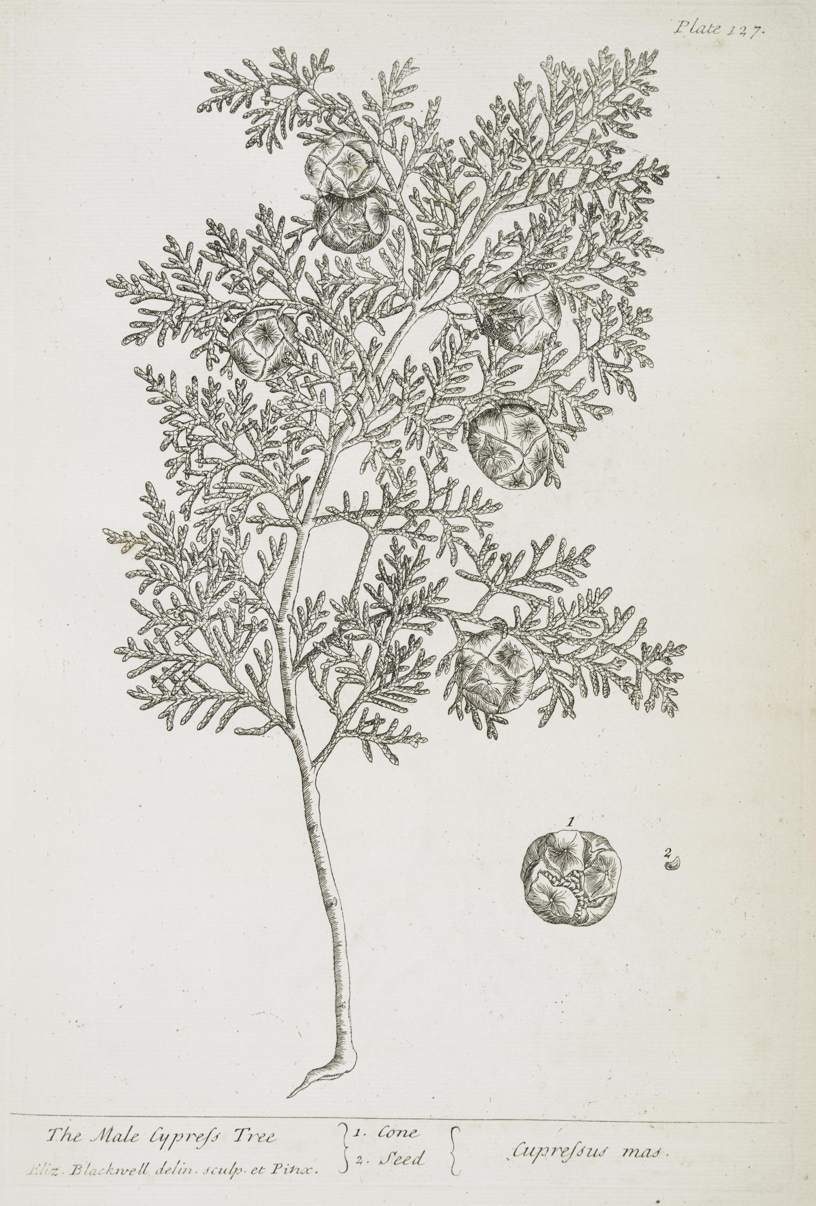 The text for this image is found on the page 125-128 The Fig Tree, The Mulberry Tree, The Male Cypress Tree, Horse Tongue in A Curious Herbal, Elizabeth Blackwell, 1737 (Vol. 1), 1739 (Vol. 2).