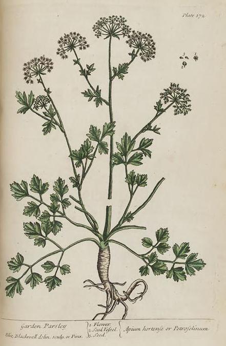 The text for this image is found on the page 169-172 Golden Rod, Fluellin, Motherwort, Garden Parsly in A Curious Herbal, Elizabeth Blackwell, 1737 (Vol. 1), 1739 (Vol. 2).