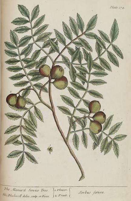 The text for this image is found on the page 173-176 Common Service Tree, Manur'd Service Tree, Bay Tree, Coriander in A Curious Herbal, Elizabeth Blackwell, 1737 (Vol. 1), 1739 (Vol. 2).