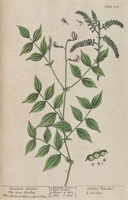 The text for this image is found on the page 205-208 The Holly-Tree, the Magellanic Bay-like Tree, Noble Liverwort, Venetia Orobus in A Curious Herbal, Elizabeth Blackwell, 1737 (Vol. 1), 1739 (Vol. 2).
