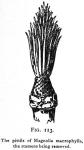 Magnolias are all trees; while one of the species in the swamps of the Northern States is a low shrub, in similar localities of the South it attains the size of a large tree. The flowers (see the plates) of Magnolia are without exception large and showy. They are solitary, and borne at the end of the branches. The sepals are three, usually spreading or reflexed, and early falling away. The petals are from six to twelve, generally nine, and are arranged in series of three. They are concave, forming a cup-shaped flower. The stamens are numerous and imbricated in spiral rows on the conical receptacle. The anthers are long, yellow, and attached to the inner side [This is one of the constant generic characters that distinguishes this genus from Liriodendron; in the latter genus the anthers are attached to the outer side of the filament and open outward.] of the filament and open by a longitudinal slit. The pistils are numerous and imbricated on the upper part of the receptacle. The fruit of all Magnolias is a fleshy cone, red or rose-colored, consisting of numerous coalescent carpels, firmly attached to the central receptacle, and, when mature, opening clown the back. Each carpel contains normally two bright scarlet seed (usually by abortion only one or none). Each seed is attached to base of carpel by a slender thread, by which, when it escapes from the carpel, it hangs suspended, instead of falling at once to the ground.