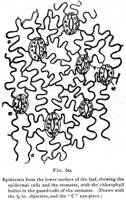 of the leaf, showing the epidermal cells and the stomates, with the chlorophyll bodies in the guard-cells of the stomates.