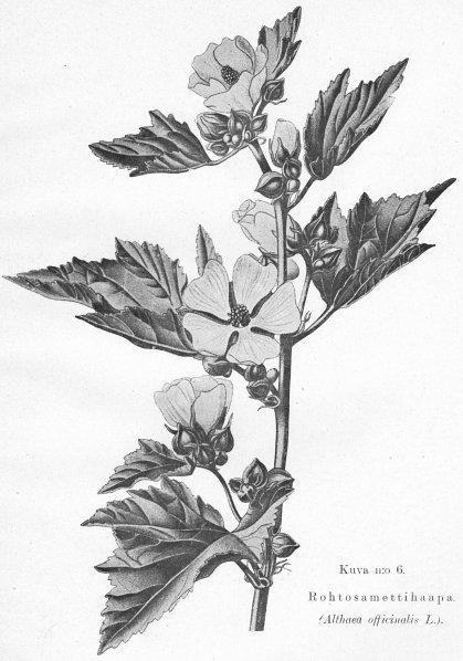 Tämä kuva on kirjasta "Ohjeita lääkekasvien viljelemiseen Suomessa", 1915, sivu Rohtosamettihaapa.