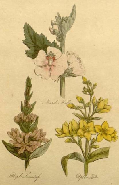 This image illustrates Purple Loosestrife, Yellow d:o, and Marsh Mallow, in The Family Herbal, John Hill, 1812.