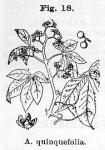 History.—The American ivy is a common and familiar shrubby vine, climbing extensively, and, by means of its radicating tendrils, supporting itself firmly upon trees, ascending to the height of 50 feet; in the same manner it ascends and overspreads walls and buildings; its large leaves constituting a luxuriant foliage of dark glossy-green. It is found in wild woods and thickets throughout the United States, and blossoms in July, ripening its small blackish berries in October. The bark and twigs are the parts used. Its taste is acrid and persistent, though not unpleasant, and its decoction is mucilaginous. The bark should be collected late in the fall, after the berries have ripened. Bernays (P. J. Tr., Vol. VII, p. 80) reports poisoning by the leaves, with severe emesis, diarrhoea, collapse, and narcosis, with dilatation of the pupils. This plant is frequently thought to be poison vine (Rhus Toxicodendron). It differs from the latter, however, among other ways, in having 5 instead of 3 leaflets, so that any one may easily differentiate the two vines. It may be handled with impunity. [Compare with illustration of Rhus Toxicodendron]. Ampelopsin, one of the old "resinoids or concentrations," is unworthy of consideration as a medicine.