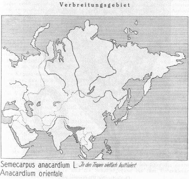 Verbreitungsgebiet: Semecarpus anacardium L. Anacardium orientale. In den Tropen vielfach kultiviert.