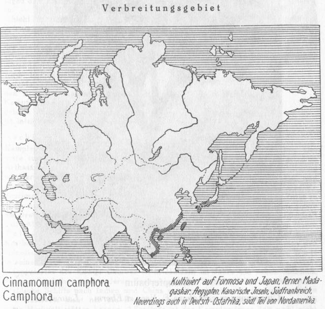 Verbreitungsgebiet: Cinnamomum camphora. Camphora. Kultiviert auf Formosa und Japan, ferner Madagaskar, Aegypten, Kanarische Inseln, Südfrankreich. Neuerdings auch in Deutsch-Ostafrika, südl. Teil von Nordamerika.