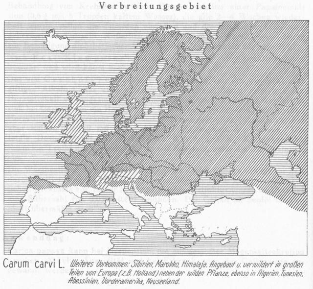 Verbreitungsgebiet: Carum carvi L. Weiteres Vorkommen: Sibirien, Marokko, Himalaya. Angebaut u. verwildert in grossen Teilen von Europa (z. B. Holland) neben der wilden Pflanze, ebenso in Algerien, Tunesien, Abessinien, Vorderamerika, Neuseeland.