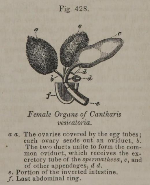 aa. The ovaries covered by the egg tubes; each ovary sends out an oviduct, b. The two ducts unite to form the common oviduct, which receives the extretory tubes of the spermatheca, c, and of other appendages, dd. e. Portion of the inverted intestine. f. Last abdominal ring.