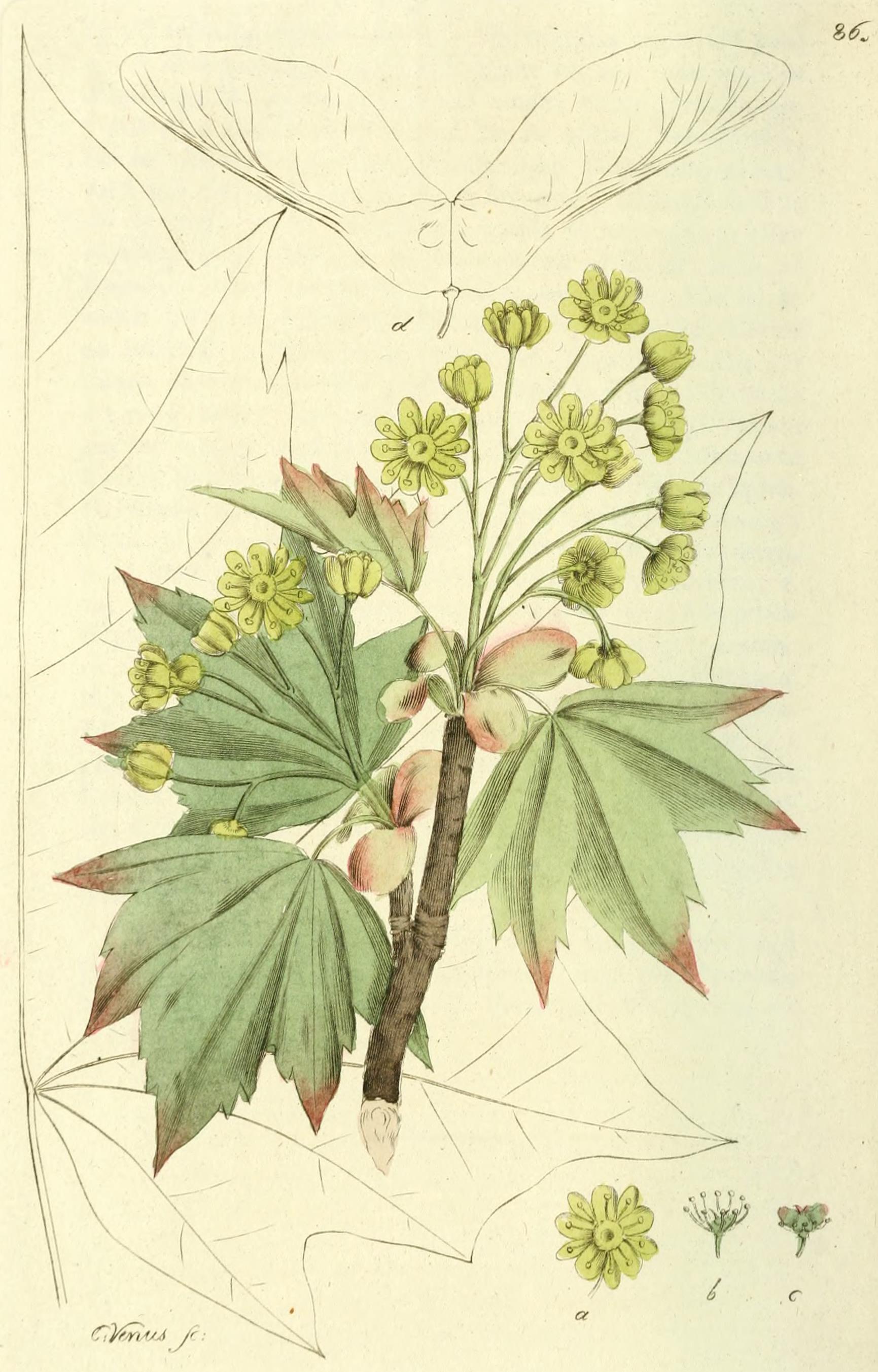 Denna bild är från boken Svensk Botanik, band 2, 1803, sida Acer platanoides.