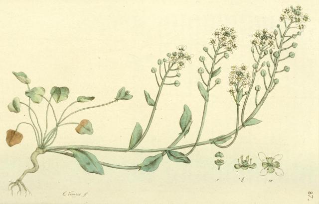 Denna bild är från boken Svensk Botanik, band 2, 1803, sida Cochlearia officinalis.