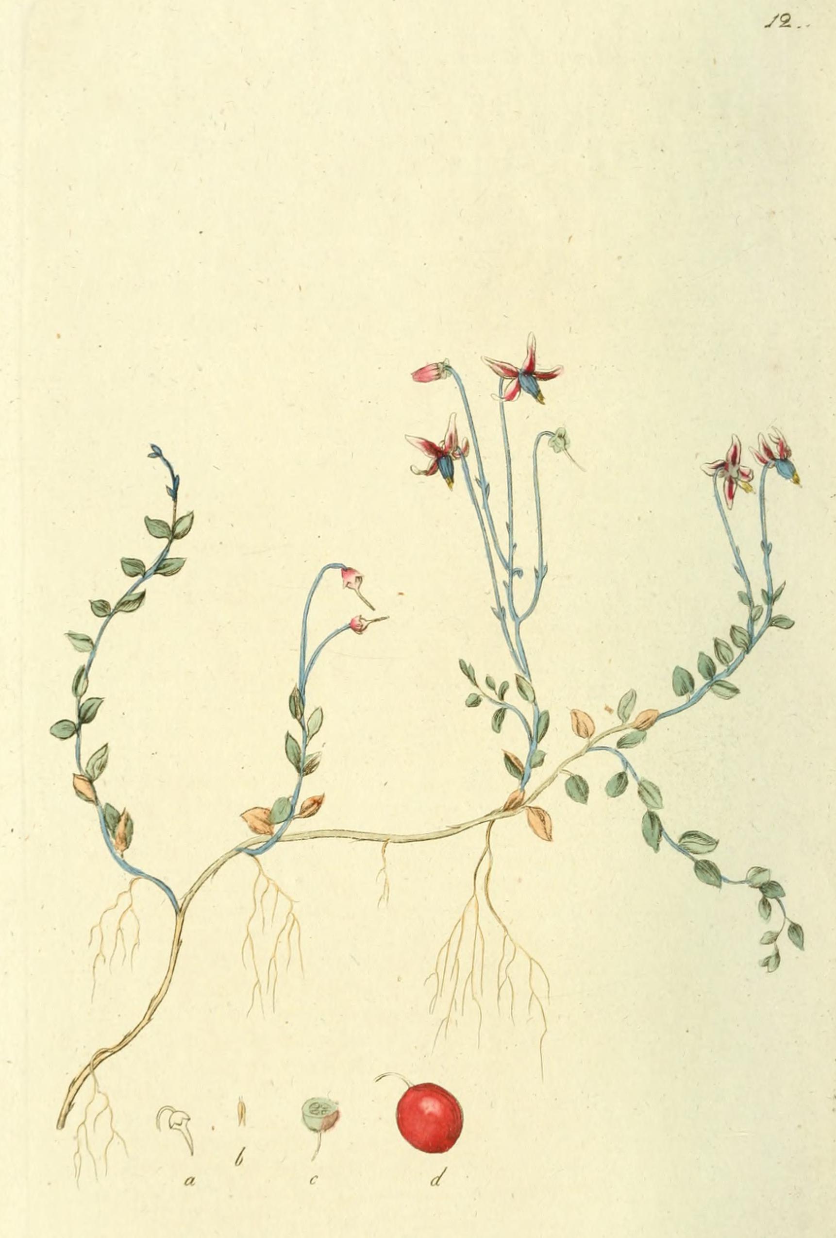 Denna bild är från boken Svensk Botanik, band 1, 1815, sida Vaccinium oxycoccos.