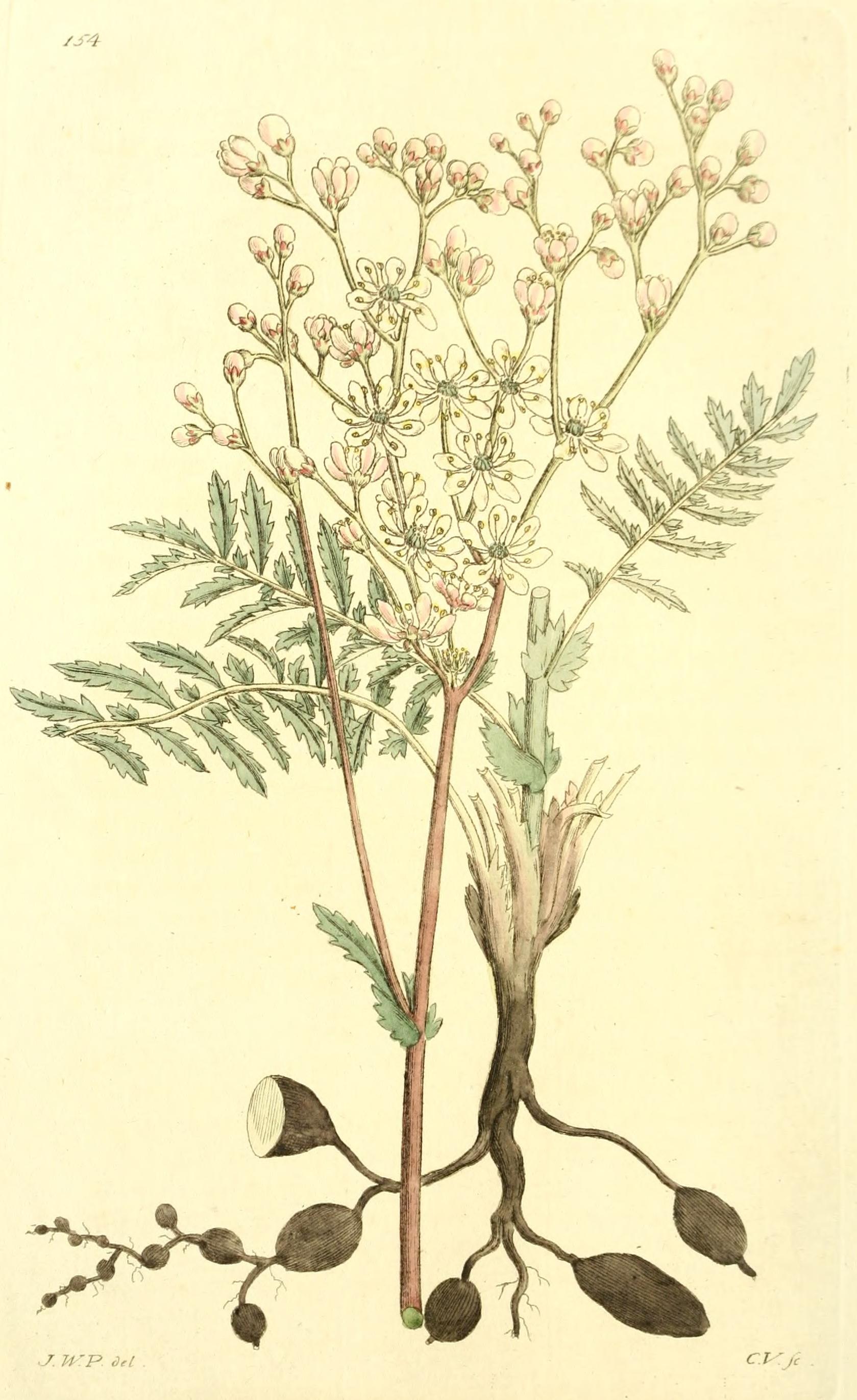 Denna bild är från boken Svensk Botanik, band 3, 1804, sida 154. Spiraea filipendula.