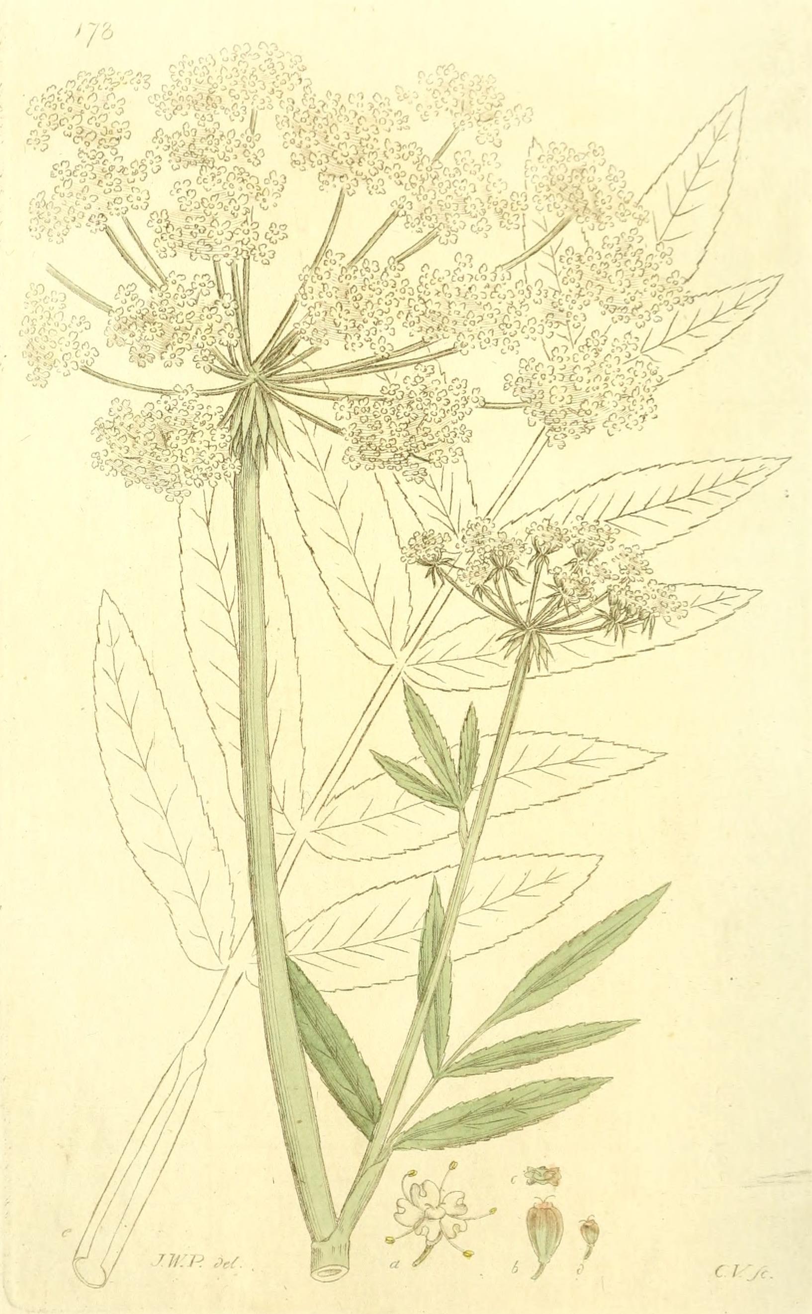 Denna bild är från boken Svensk Botanik, band 3, 1804, sida 178. Sium latifolium. Bredbladig Sium.