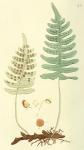 Stensötan, icke sällsam i bergspringor och steniga branter, hör till det slägtet bland Ormbunkarna, som man kallar Bräken, utmärkt genom sin fröredning, hvilken samlad i runda och strödda punkter utbrister vid midsommarstiden på bakre sidan af stambladet, men utan någon betäckning (indusium, involucrum), hvarmedelst ett stort antal af de arter, som till samma slägte blifvit förde, äro försedde, och med skäl kunna utgöra ett eget, hvartill vår Träjon, (Polypodium Filix mas L.) bör föras. Man har kallat detta slägte Aspidium, Polystichum, till skillnad från Polypodium. Fröredningspunkterne utgöras af ett oräkneligt antal små, klotrunda, mörkbruna kapsler (fig. b.), hvarje särskilt fästade vid punkten med en trådlik genomskinlig fot. Midtpå omgifver dem en ledfull ring, medelst hvilken de vid mognaden spänstigt öppnas och kringsprida de för blotta ögat knappt skiljbara fröstoften (fig. d.). Det felas ännu de örtkunniga nog klara begrepp om dessa vexters blomningssätt; men att de nämde kapslerne äro fröhus, är otvifvelaktigt, ty man har genom såning af dem fortplantat flera arter.