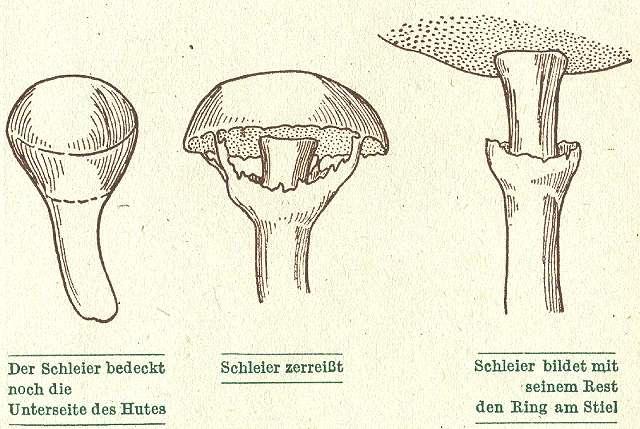 Der Schleier bedeckt noch die Unterseite des Hutes / Schleier zerreisst / Schleier bildet mit seinem Rest den Ring am Stiel.
