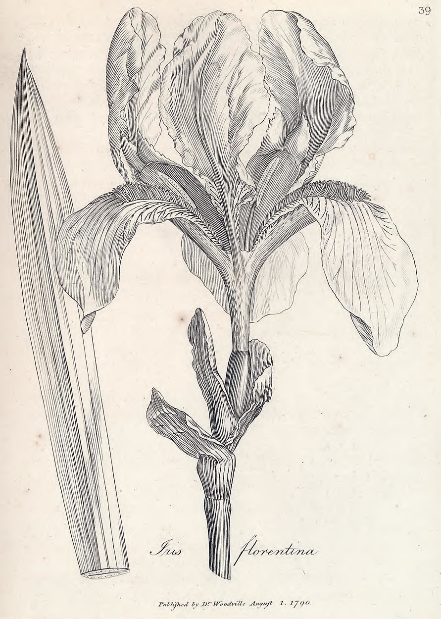 This image is from 039. Iris florentina. Florentine orris, or iris. in Medical Botany, Woodville, 1790-1794.