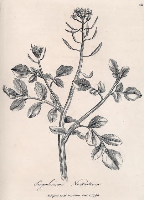 This image is from 048. Sisymbrium nasturtium. Water-cresses. in Medical Botany, Woodville, 1790-1794.