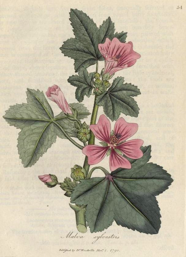 This image is from 054. Malva sylvestris. Common mallow. in Medical Botany, Woodville, 1790-1794.