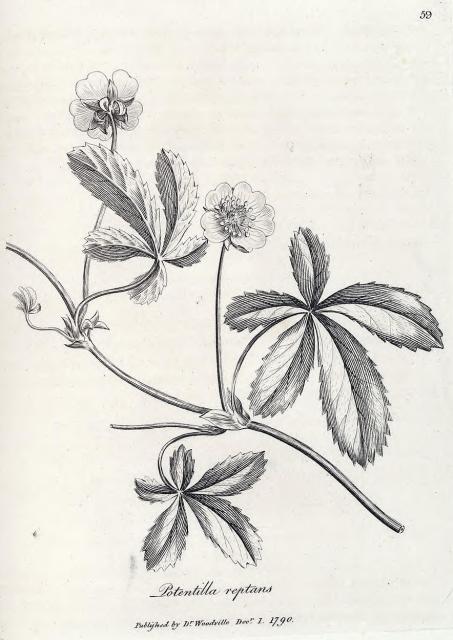 This image is from 059. Potentilla reptans. Common cinquefoil. in Medical Botany, Woodville, 1790-1794.