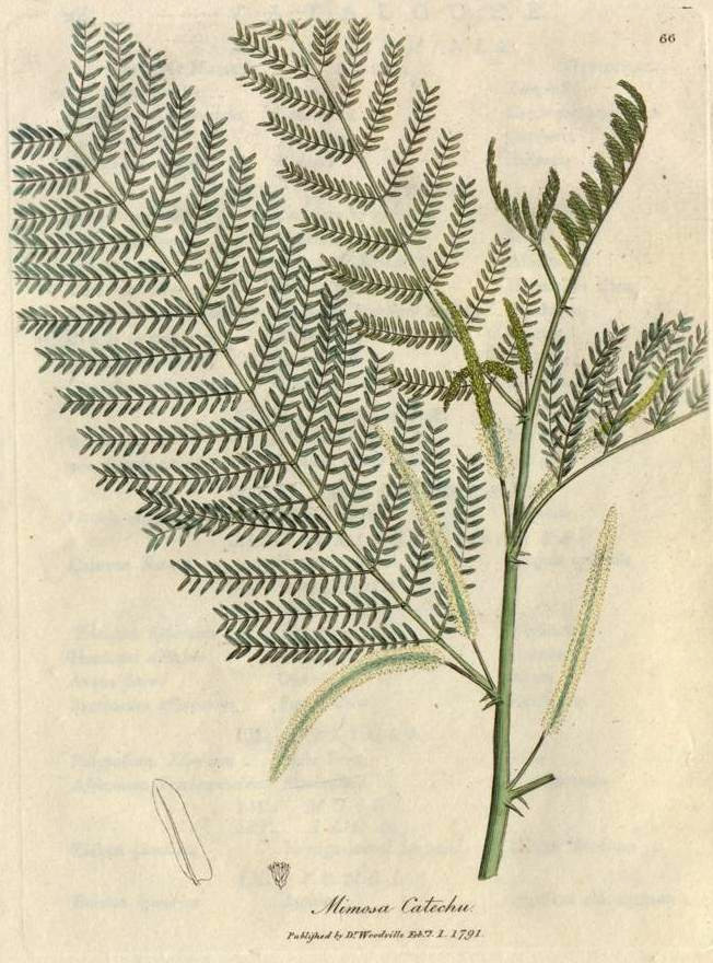 This image is from 066. Mimosa catechu. Catechu mimosa. in Medical Botany, Woodville, 1790-1794.