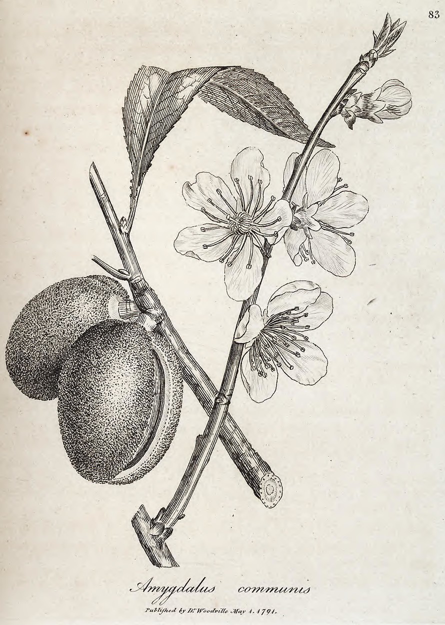 This image is from 083. Amygdalus communus. The almond tree. in Medical Botany, Woodville, 1790-1794.