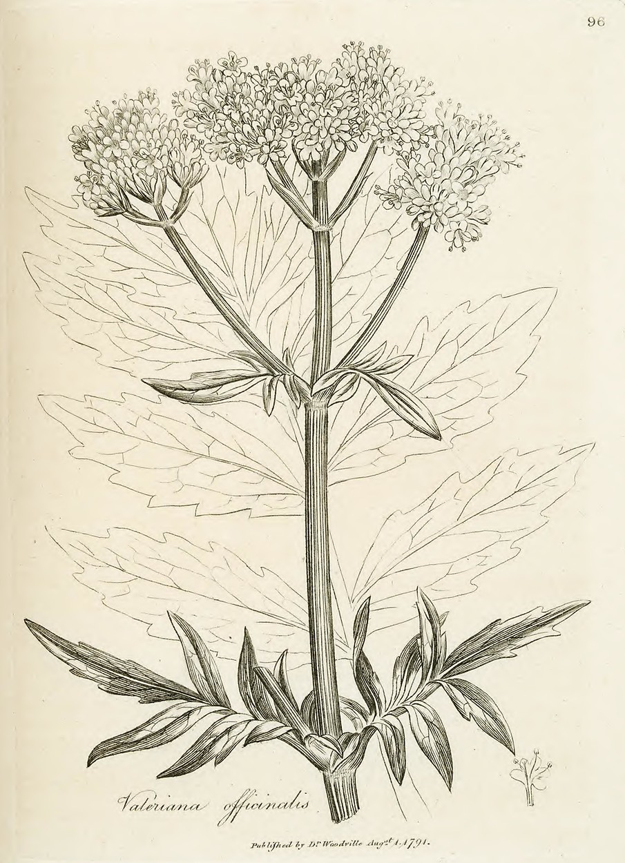 This image is from 096. Valeriana officinalis. Officinal Valerian. in Medical Botany, Woodville, 1790-1794.