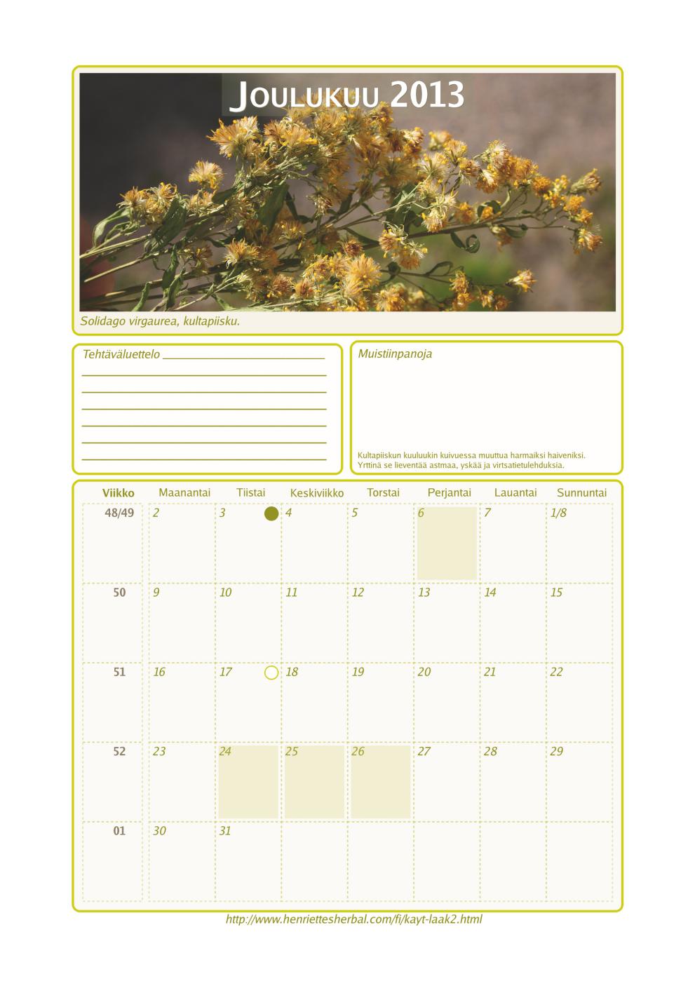 Yrttiseinäkalenteri 2013, joulukuu.