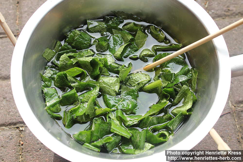 Fresh leaf in oil on a waterbath (bain marie, double boiler). Tapanila, Helsinki, Finland. Processed. 2012-06-27.