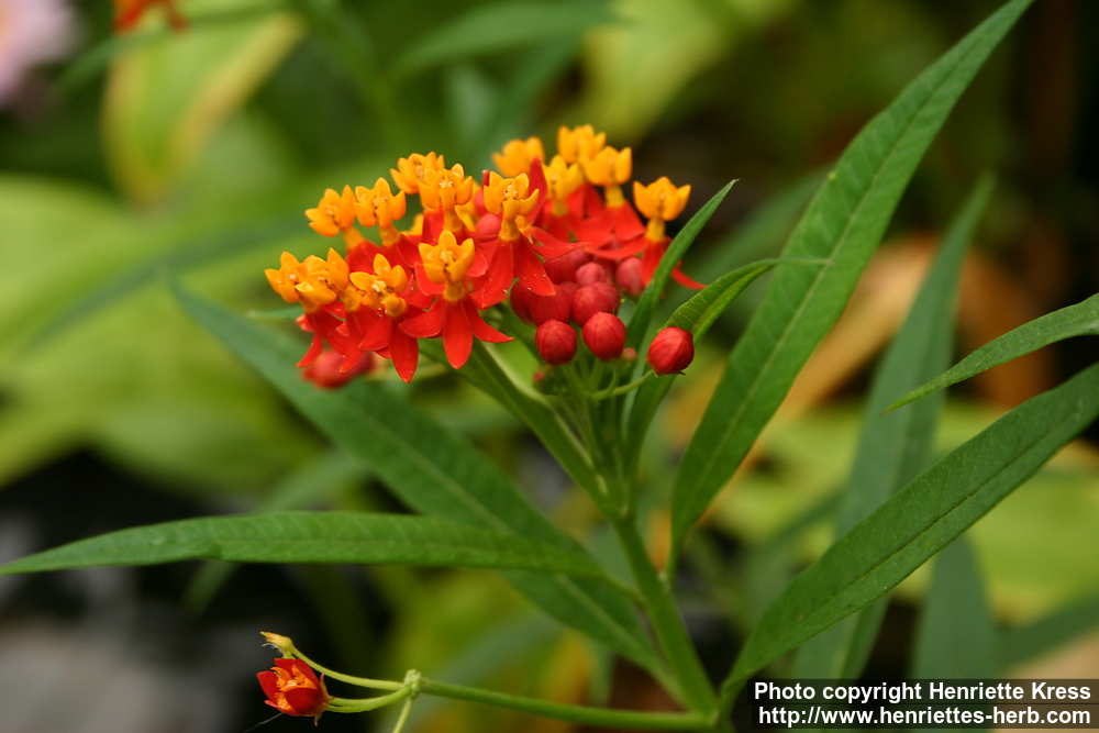 Engl.: blood flower, bastard ipecac, bastard ipecacuanha, blood-weed, bloodflower milkweed, butterfly weed, false ipecac, garden silkweed, Indian root, milkweed, redhead, scarlet milkweed, tropical milkweed, vegetable silk.