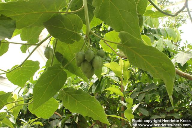 Green fruit and leaf. Bergianska trädgården, Stockholm, Sweden. Greenhouse. 2011-07-13.