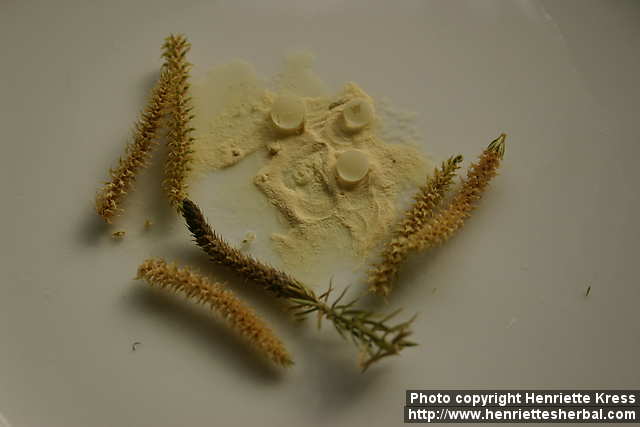 Nikt - the spore powder - repels water. Dried seedheads, nikt, and three drops of water. Helsinki, Finland. Indoors. 2007-05-06.