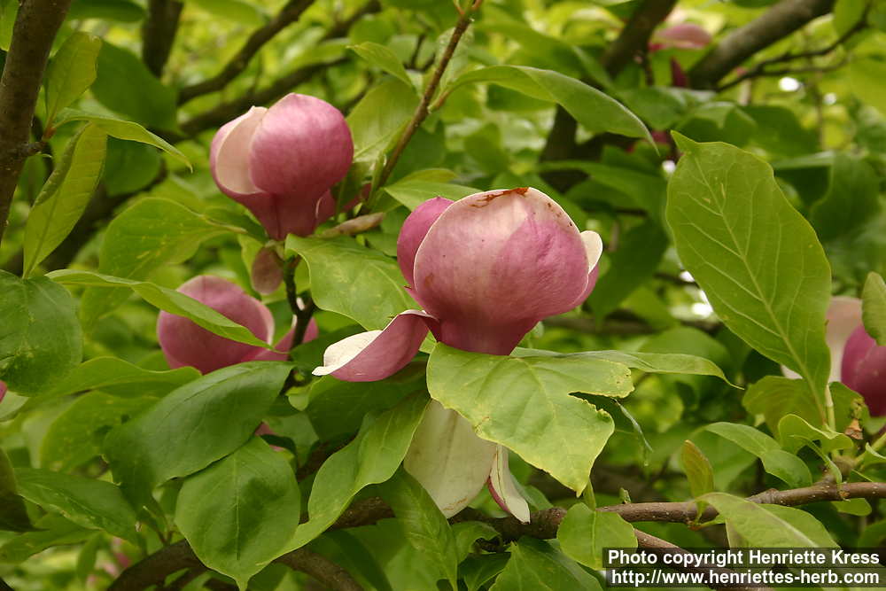 Bot. syn.: Magnolia heptapetala (Buc'hoz) Dandy x quinquepeta Buc'hoz) Dandy, Magnolia x lenneana (Lem.) Koehne, Magnolia x lennei (Van Houtte), Yulania x lenneana (Lem.)