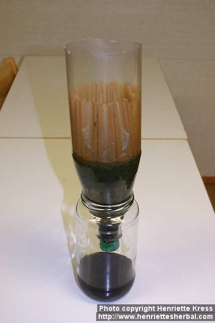 A simple percolator setup: sawn-off large bottle with almost shut cap on top of a glass jar. Perheniemi, Finland. Processing. 2004-12-08.