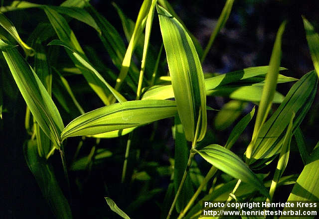 Engl.: kamuro bamboo, dwarf greenstripe bamboo, golden-striped green-leaved dwarf bamboo, green-striped golden-leaved dwarf bamboo, knee-high variegated pleioblastus.