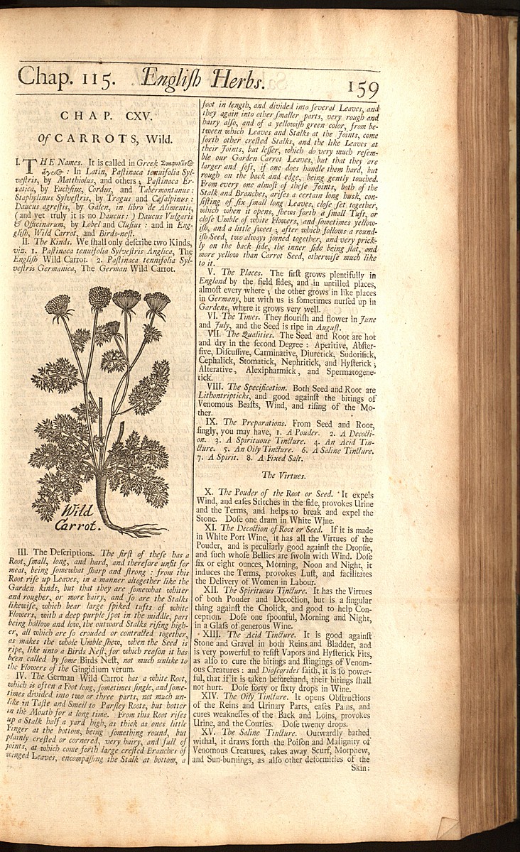 Gallery: Salmon 1710 ProofreadThis is a page to be proofread from Salmon's Botanologia, 1710. See Chap. 115. Of Carrots, Wild. Book Navigation ‹ 00194 up 00196 ›