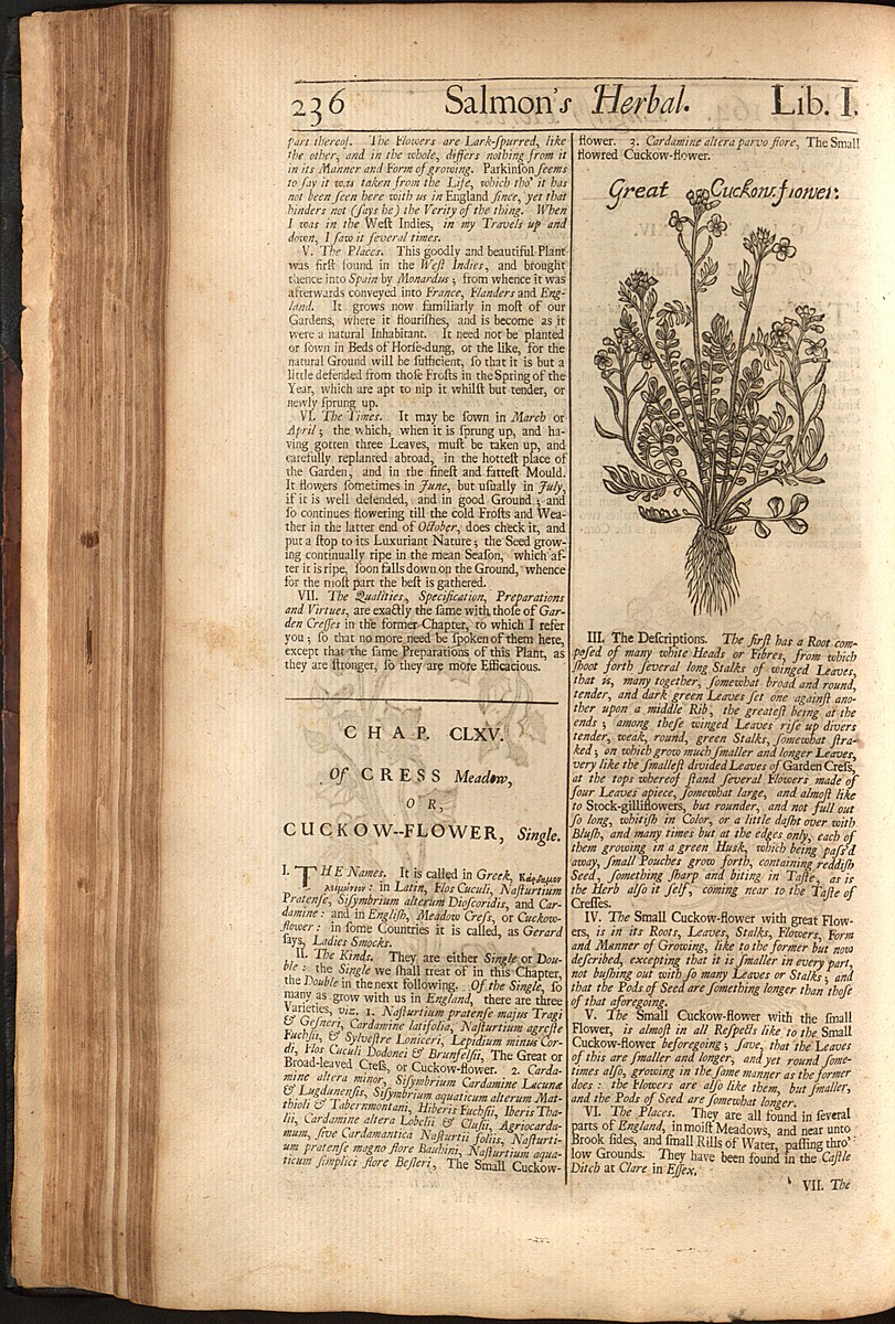 Gallery: Salmon 1710 ProofreadThis is a page to be proofread from Salmon's Botanologia, 1710. See Chap. 164. Of Cress Indian. See Chap. 165. Of Cress Meadow, or Cuckow-Flower, single. Book Navigation ‹ 00271 up 00273 ›